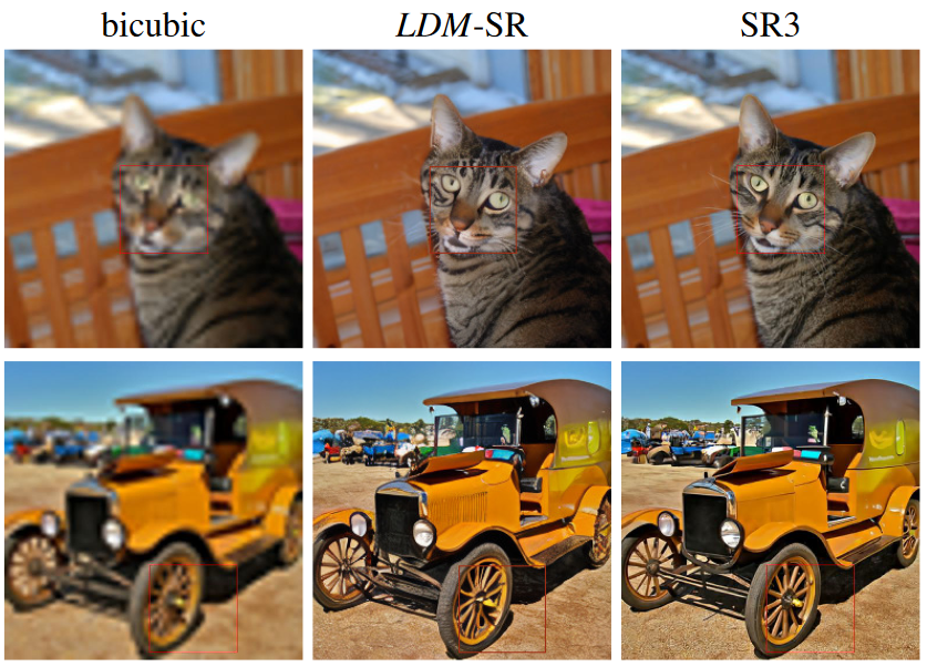 LDM은 저해상도의 이미지를 conditioning하여 고해상도 이미지 합성을 학습할 수 있다. 아래 그림은 ImageNet-Val, LDM-SR의 64$\rightarrow$256 upscaling 샘플들이다.