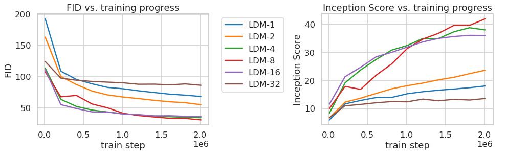 위 그래프는 class-conditional model을 ImageNet 데이터셋으로 2M steps 학습하는 동안 모델의 성능 변화를 나타낸다. 그래프로부터 다음과 같은 사실을 알 수 있다. 1. 작은 downsampling factor ($f=1, 2$)는 학습을 느리게 만든다. 2. 너무 큰 downsampling factor ($f=32$)는 특정 스텝 이후로 학습이 정체되게 만든다. 이러한 결과는 다음과 같이 이해할 수 있다. 1. first stage에서 perceptual compression이 거의 진행되지 않았다. 2. first stage에서 compression이 과하게 진행되어 정보가 손실되었다. $f=4, 8, 16$의 경우에 효율성과 품질 사이에서 적절한 균형을 유지하는 것을 알 수 있다.