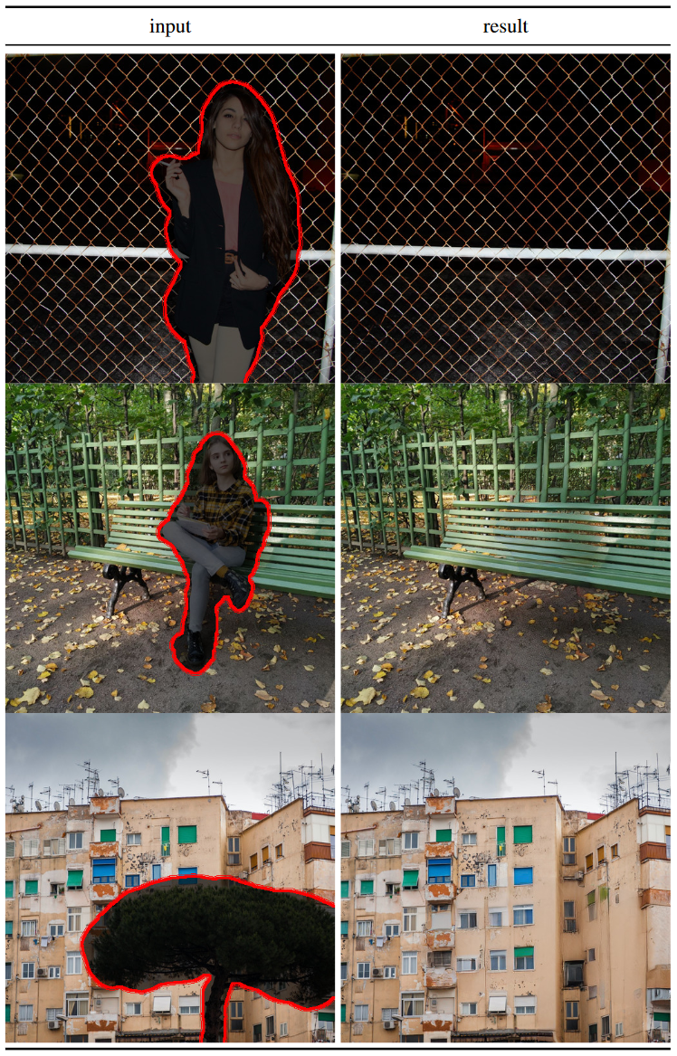 Inpainting은 이미지의 마스킹된 부분을 새로 채우는 작업이다. 미완성 이미지의 비어있는 부분을 채울 수도 있고 마스킹된 부분의 물체를 다른 물체로 대체할 수도 있다. 아래 그림은 object removal을 시도한 결과이다.