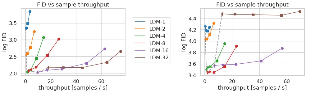 위 그래프는 각각 CelebA-HQ와 ImageNet 데이터셋에서 학습한 모델의 성능을 비교한 결과를 나타낸다. 각 모델은 여러 denoising step에서 학습되었다. $f=4, 8$의 경우에 가장 좋은 성능을 보여주는 것을 확인할 수 있다. 특히 latent space를 거치지 않은 pixel-based model인 $LDM-1$에 비해 낮은 FID를 달성하면서도 훨씬 빠른 샘플링 속도를 보인다.