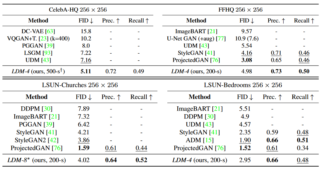 CelebA-HQ 데이터셋에서 FID에서 SOTA를 달성했으며, 다른 데이터셋에서도 기존 모델보다 훨씬 적은 computing cost만으로 밀리지 비슷한 성능을 보인다. GAN based 모델에 비해 likelihood based 모델인 LDM이 높은 precision과 recall을 보이는 것도 확인할 수 있다.